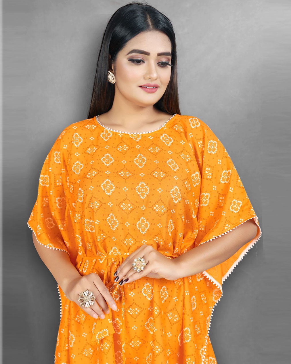 True elegance will come out of your dressing trend with this Yellow Kaftan. Beautified with Bandhani Print work adds a sign of elegance statement with your look. This frees size stitched dress is made by cotton. Team it with stylish accessories to make your looks more beautiful. This attractive Kaftan dress will surely fetch you compliments for your rich sense of style.