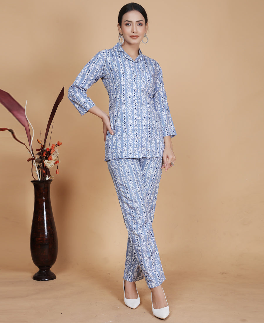 Turn heads with this stylish printed co-ord set — your go-to for effortlessly versatile fashion. Featuring a vibrant yet elegant design, it transitions seamlessly from casual strolls to on-the-go office hours. Made from lightweight, breathable Twil Cotton, it wraps you in all-day comfort. The modern pocket detail on the bottoms adds a practical, contemporary touch to complete the look.