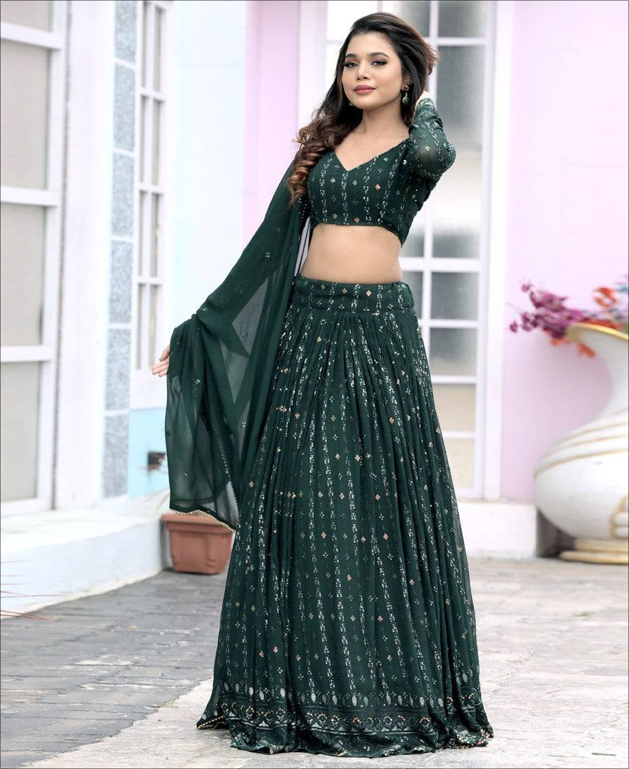 Transform in an instant into an icon of elegance with this bottle green colored lehenga. the lehenga is beautified with sequence work which is eye catching. this semi-stitched georgette lehenga comes along with unstitched blouse and georgette dupatta, women can buy this suit to wear for their upcoming functions, festivals, parties, event and occasions, where you want to be center of attraction. team it with stylish accessories to make your looks more beautiful. this attractive suit will surely fetch you compliments for your rich sense of style.measurement : to 3 to 3.25 meter lehenga flair,2.3 meter dupatta, 1 meter blouse,waist - up to 40" to 42".