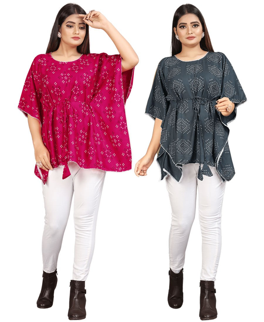 Vogue and trend would be on the peak of your splendor when you dresses this Pack of 2 Kaftan. Beautified with Bandhani Print work adds a sign of elegance statement with your look. This frees size stitched dress is made by cotton. Team it with stylish accessories to make your looks more beautiful. This attractive Kaftan dress will surely fetch you compliments for your rich sense of style.