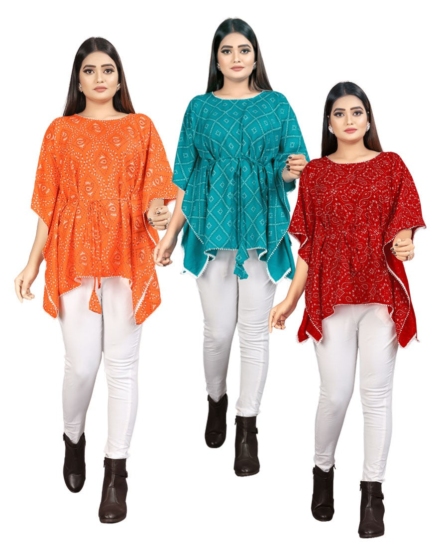 True elegance will come out of your dressing trend with this Pack of 3 Kaftan. Beautified with Bandhani Print work adds a sign of elegance statement with your look. This frees size stitched dress is made by cotton. Team it with stylish accessories to make your looks more beautiful. This attractive Kaftan dress will surely fetch you compliments for your rich sense of style.