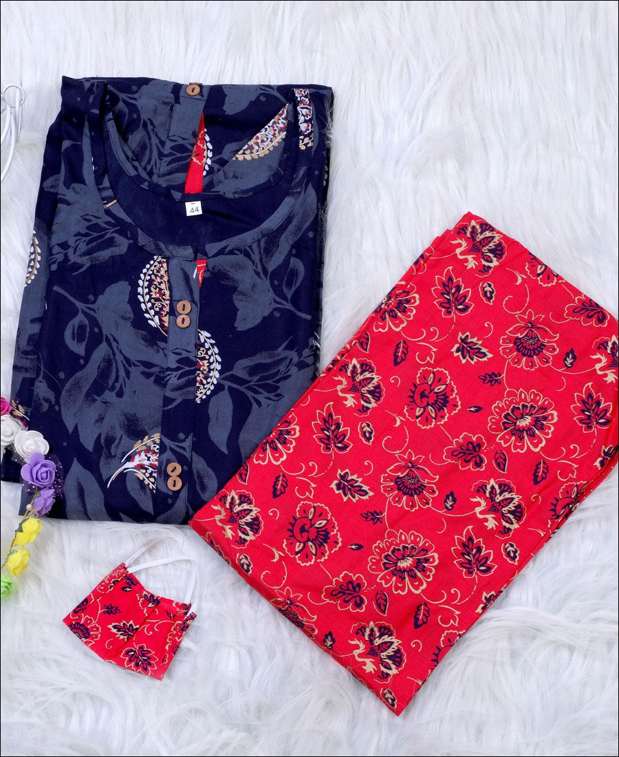Create a smoldering impact by this Blue color Kurti Beautified with Block Print. Readymade Kurti comes with a Top | Bottom & Matching face Mask. This stitched kurti is perfect to pick for party, weekend get-together, kitty parties and events. Pair it up with leggings, cigarette pants to create a contrasting effect, along with heels & stylish accessories.