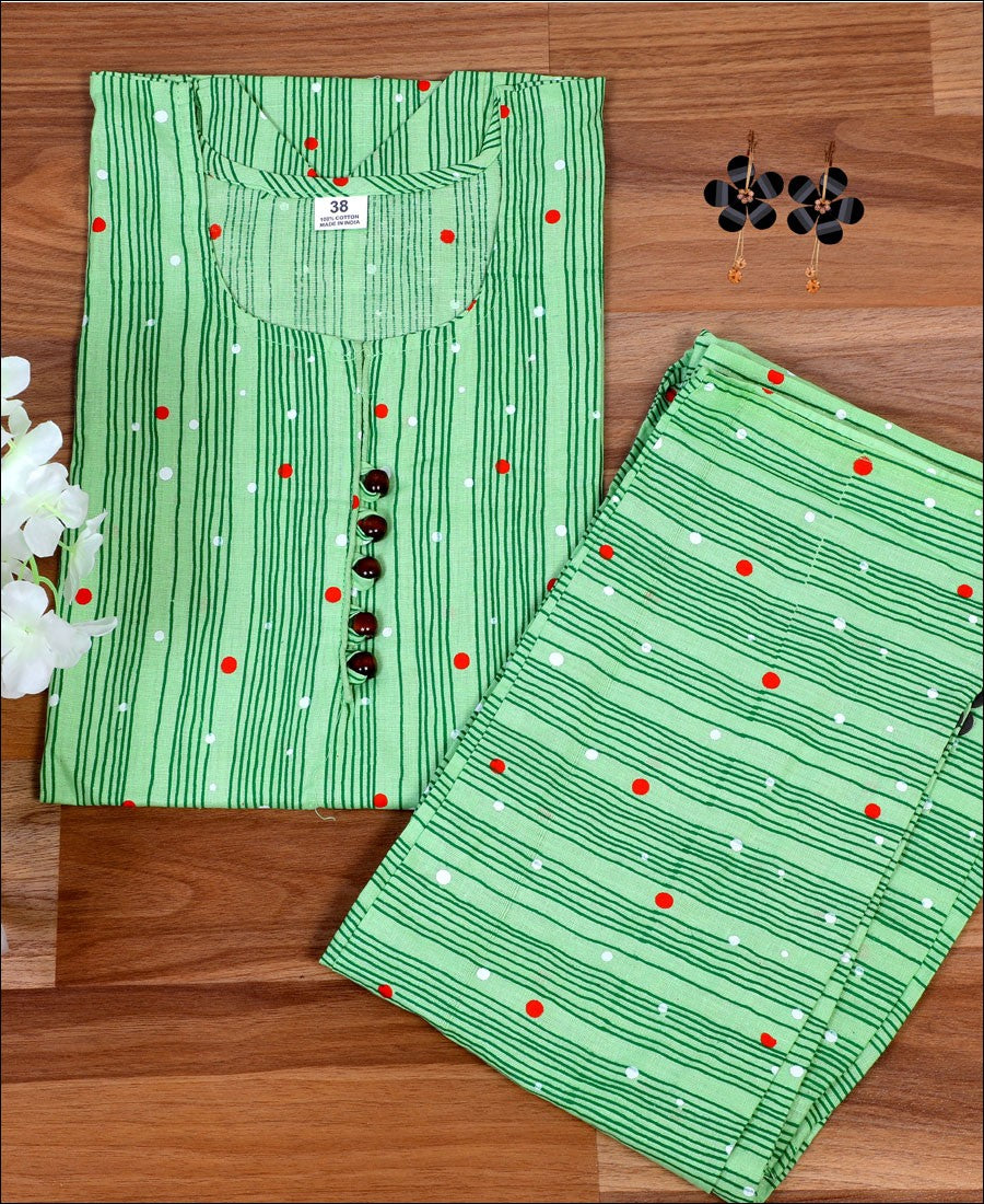 Look ravel and stylish in this Green color Kurti Beautified with Block Print. Readymade Kurti comes with a Top & Bottom. This stitched kurti is perfect to pick for party, weekend get-together, kitty parties and events. Pair it up with leggings, cigarette pants to create a contrasting effect, along with heels & stylish accessories.