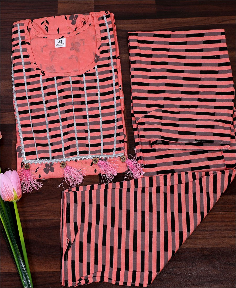 Create a smoldering impact by this Peach color Kurti Beautified with Gota Patti - Block Print. Readymade Kurti comes with a Top & Bottom. This stitched kurti is perfect to pick for party, weekend get-together, kitty parties and events. Pair it up with leggings, cigarette pants to create a contrasting effect, along with heels & stylish accessories.