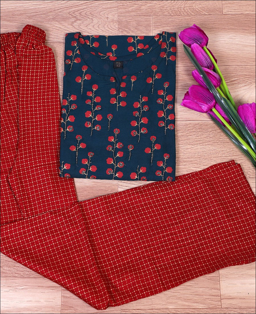 Dark Green Coloured Cotton Block Print With Hand Work Kurti Set