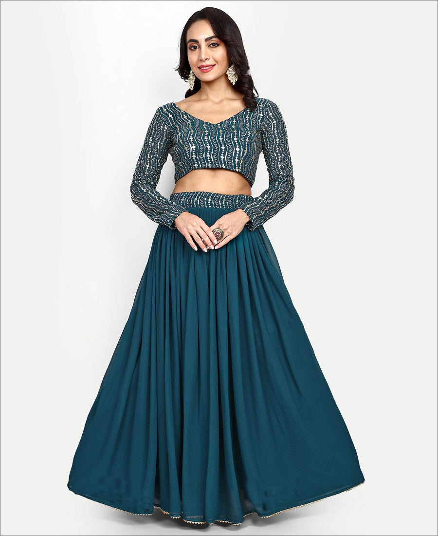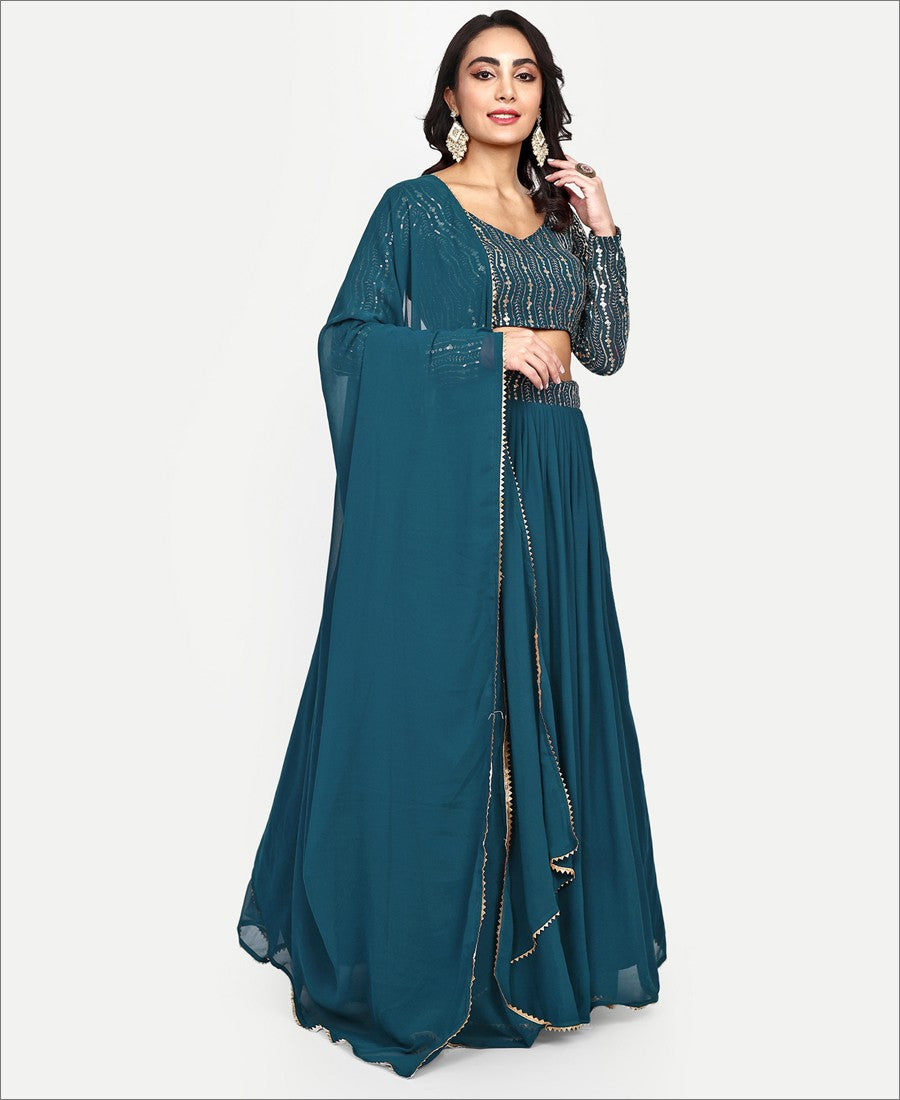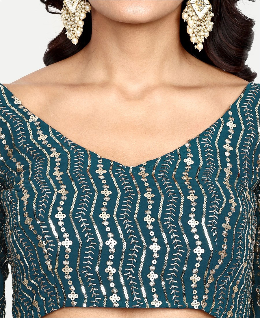 Elegance and honourable come together in this deep sea blue colored georgette lehenga choli.Comes along with georgette sequence work blouse and georgette dupatta to complete the look. Women can buy this suit to wear for their upcoming functions, festivals, parties, event and occasions, where you want to be center of attraction. Team it with stylish accessories to make your looks more beautiful. This attractive suit will surely fetch you compliments for your rich sense of style. measurement : 3 meter lehenga flair,2 meter dupatta, 0.80 meter blouse,waist - up to 40".