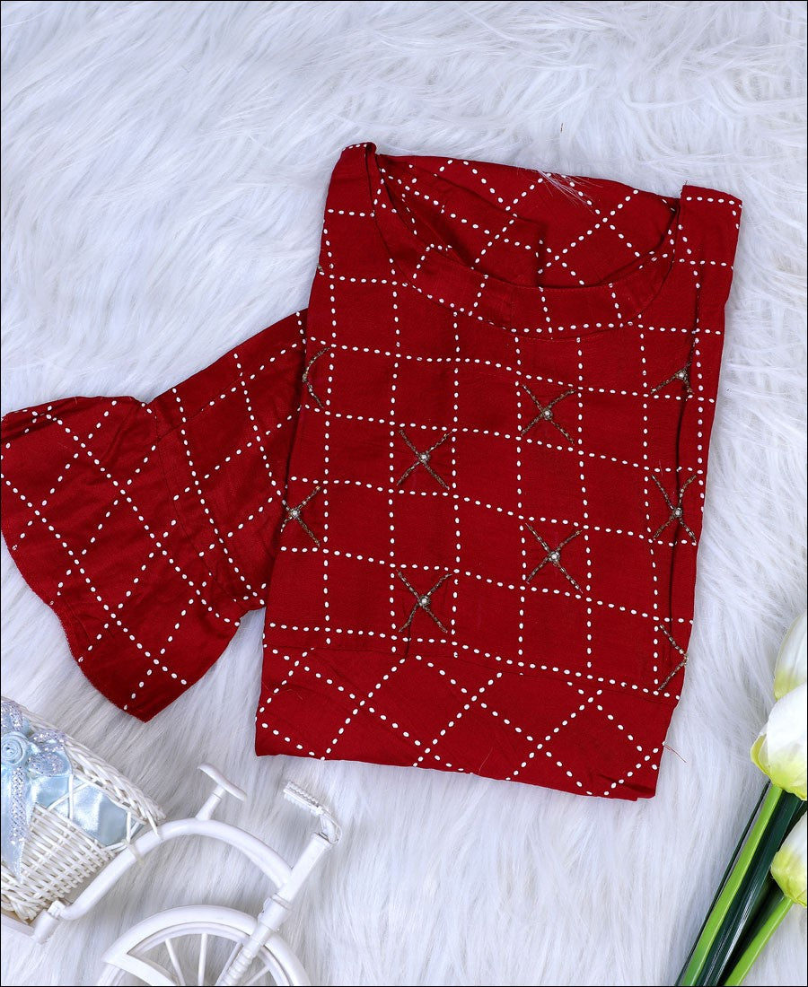 Maroon Coloured Rayon Block Print With Hand Work Kurti