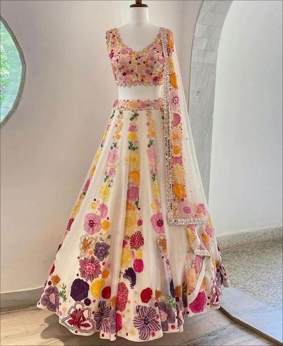 Pamper the women in you with this cream colored lehenga choli. Beautified with amazing sequence embroidery and thread work within the attire adds a sign of elegance statement with your look. The semi-stitched lehenga is made of georgette fabric accompanied with embroidered georgette fabric blouse piece and georgette dupatta. Women can buy this lehenga choli to wear for their functions, festivals, wedding functions or engagement ceremonies and occasions, where you want to be center of attraction. Team it with traditional accessories to make your looks more beautiful. Buy this lehenga choli and earn lots of compliments from onlookers. Measurement : Nearly 3 meter lehenga flair, 2.25 meter dupatta, 0.80 meter blouse, lehenga length 42", waist upto 42".