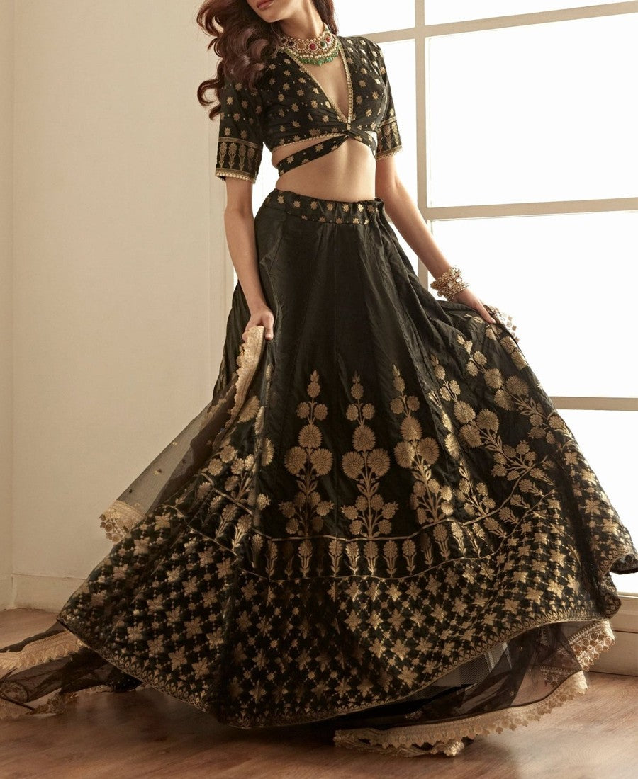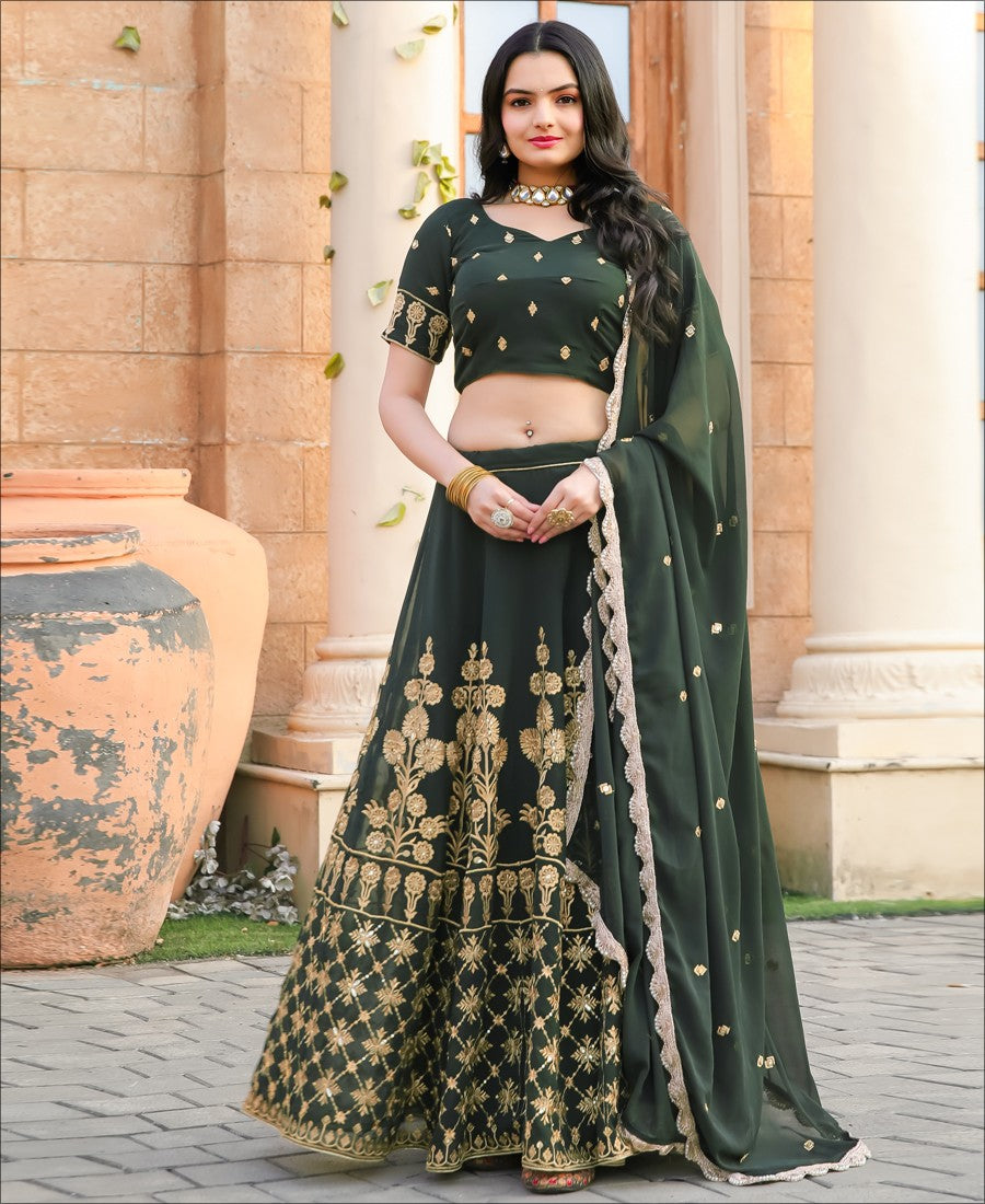 Everyone will admire you when you wear this sensational dark green colored lehenga choli.The semi-stitched lehenga is made of faux georgette fabric accompanied with unstitched georgette fabric blouse piece and geogette golden lace border dupatta.the lehenga is beautified with zari work which is eye catching. Women can buy this lehenga choli to wear for their functions, festivals, wedding functions or engagement ceremonies and occasions, where you want to be center of attraction. Team it with traditional accessories to make your looks more beautiful. Buy this lehenga choli and earn lots of compliments from onlookers.measurement : 3 to 3.25 meter lehenga flair,2.25 meter dupatta, 0.80 meter blouse,waist - up to 40" to 42".