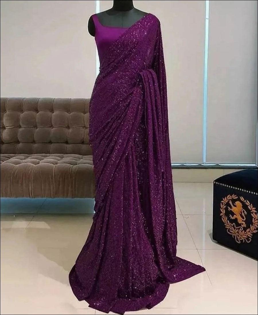 Add grace and charm towards the appearance in this Purple color saree is made of heavy Georgette fabric which is highlighted with Beautiful Tone to Tone double Stitch Sequence work as shown. It comes in 5.5 Mtrs with 0.8 Mtr unstitched Banglori Silk cloth for blouse piece which can be stitched as per your choice and requirement.