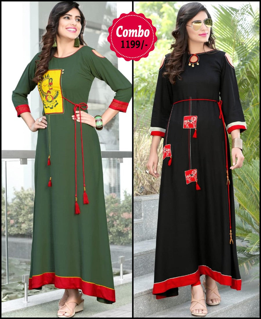 RE - Elegant green and black color rayon print stitched kurti - Pack of 2