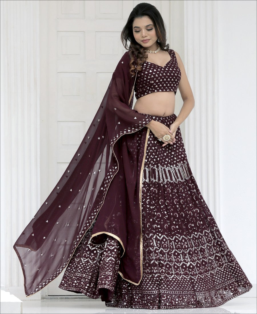 Give your vibrant highlight to your ethnic attire with this brown colored lehenga choli.Beautified with amazing sequence work within the attire adds a sign of elegance statement with your look.The semi-stitched lehenga is made of georgette fabric accompanied with unstitched blouse piece and georgette dupatta.Women can buy this lehenga choli to wear for their functions, festivals, wedding functions or engagement ceremonies and occasions,where Measurement : Nearly 3 to 3.25 meter lehenga flair, 2.25 meter dupatta, 0.80 meter blouse, lehenga length 42", waist upto 42". you want to be center of attraction.