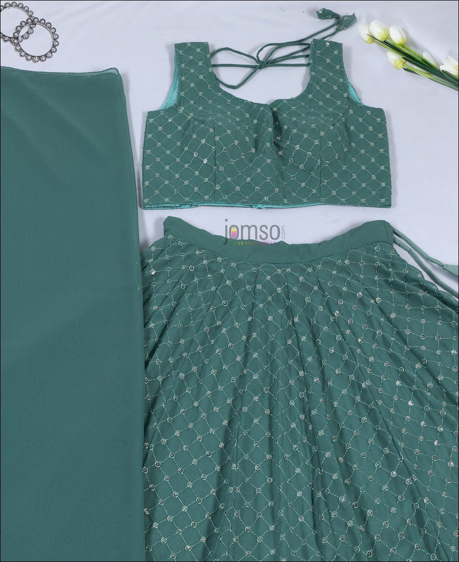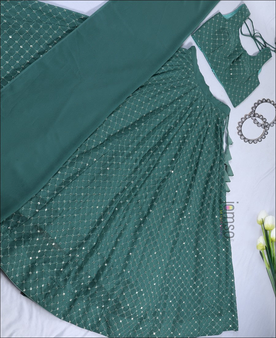 Refresh your look wearing this gorgeous teal green colored lehenga choli.The georgette lehenga is beautified with sequence and thread embroidery work as shown.The choli is made of georgette sequence work blouse with fancy georgette dupatta. Specially designed to wear in weddings, functions, engagements, ceremonies and special occasions. Teaming this lehenga with jewellery and high heels that would be an added attraction.measurement : 3 meter lehenga flair,2 meter dupatta, 0.80 meter blouse,waist - up to 40".